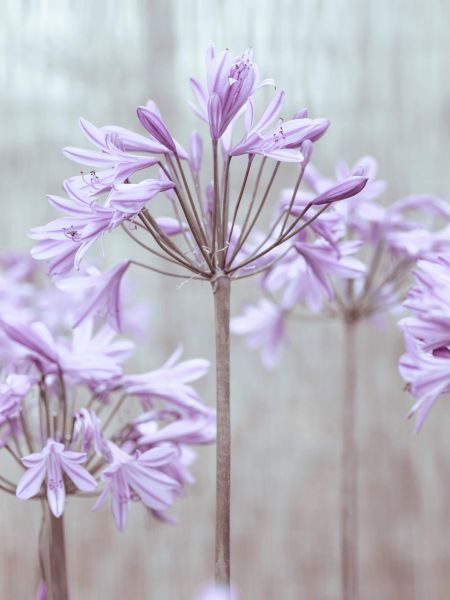 In diesem verträumten Bild strecken sich zarte violette Blumen im weichen Licht aus, umgeben von einem dunstigen Schleier der Gelassenheit. Die subtilen Farbtöne und der zarte Fokus der Blumen suggerieren eine Welt der Ruhe und natürlichen Schönheit.