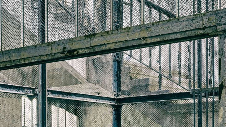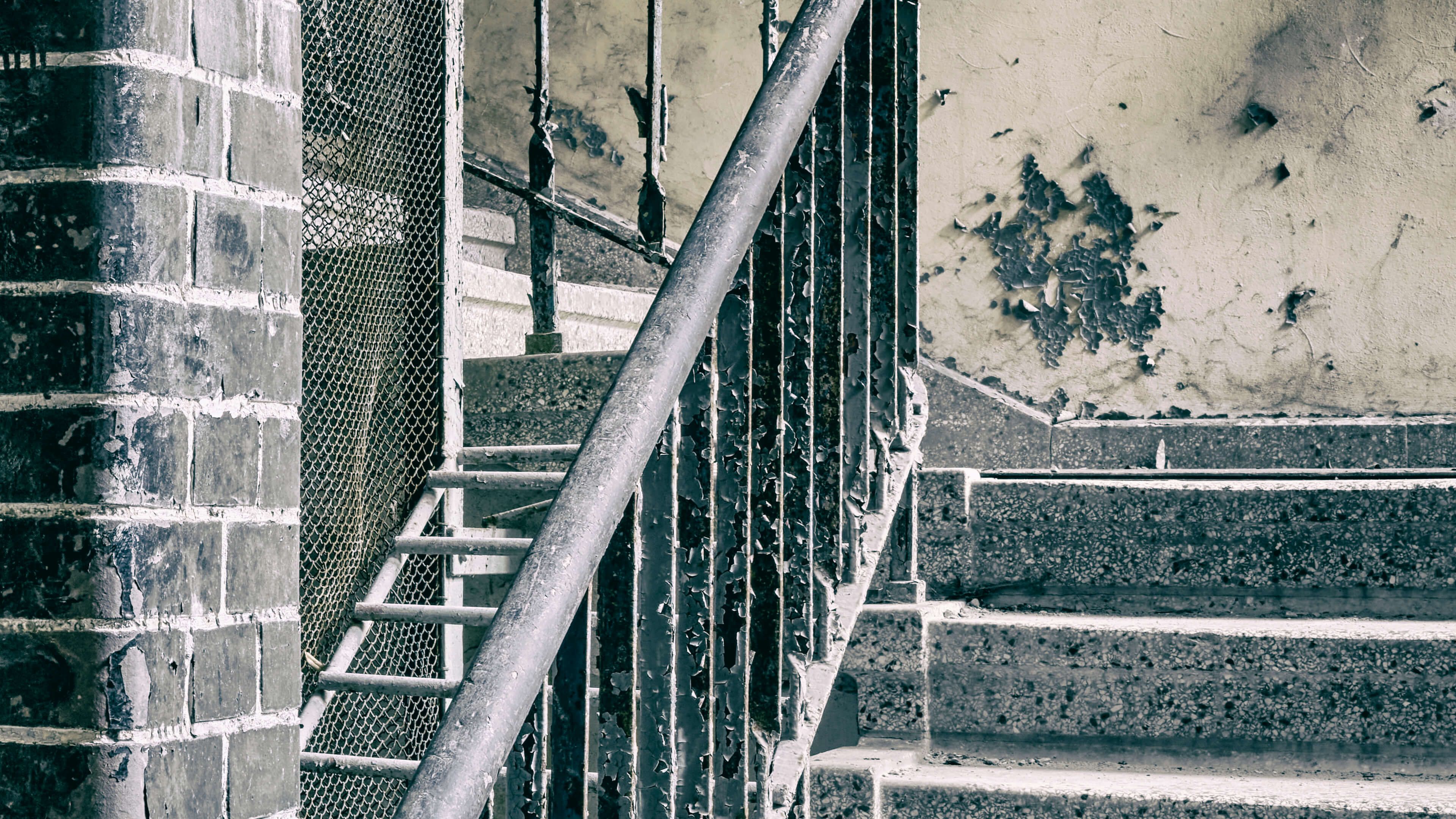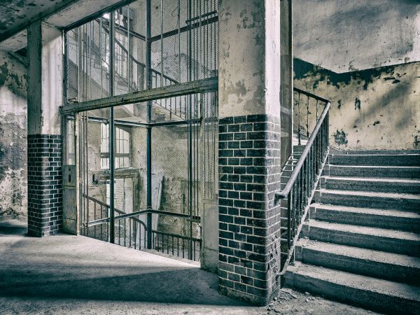 Alte Treppe und Aufzugsschacht in verschiedenen Materialien