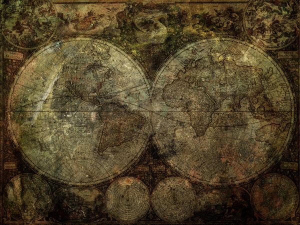 Eine alte antike Weltkarte auf Fototapete. Die alte Weltkarte sieht aus wie eine Karte aus einem Film.