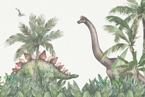 Tolle Dinosaurier im Dschungel mit verschiedenen Pflanzen und Palmen. Ideal für ein Kleinkind- oder Kinderzimmer.