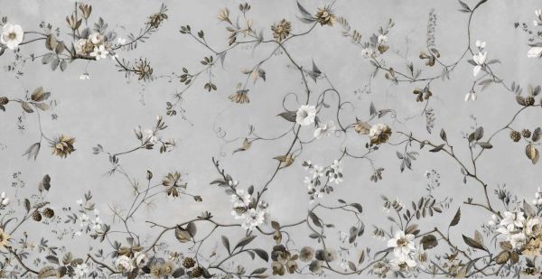 Eine verfeinerte Spiel aus feinen, gewundenen Ästen mit kleinen Blütenknospen und zarten Blättern bildet eine luftige Komposition vor einem sanft grauen Hintergrund. Die Farbpalette besteht aus warmen Sepia-, Sand- und Taupetönen, ergänzt durch sanftes Creme und verwaschenes Grün. Durch den dezenten Kontrast entsteht ein ruhiges und harmonisches Bild, das subtil vorhanden ist, ohne zu dominieren. Die feine Linienführung und zarten Details verleihen dem Ganzen eine elegante, fast botanisch-illustrative Ausstrahlung. In einem klassischen Interieur verstärkt dieser Druck die zeitlose Atmosphäre. Kombinieren Sie ihn mit Holzmöbeln in Noten- oder Eichtönen, Stoffen wie Leinen und Wolle in Neutraltönen und Accessoires aus Keramik oder matt Gold. Ein eleganter Spiegel, eine klassische Kommode oder ein gepolsterter Sessel mit sanften Rundungen schließen hier wunderschön daran an. Auch innerhalb eines modernen oder minimalistischen Interieurs sorgt dieses Muster für Wärme und Verfeinerung. Glatte Möbel in Hellgrau, Beige oder Gebrochenes Weiß bilden eine ruhige Basis, während natürliche Materialien wie Travertin, Rattan oder helles Holz zusätzliche Tiefe hinzufügen. Diese subtile botanische Komposition kommt besonders gut zur Geltung in einem Schlafzimmer, Flur oder stilvollem Arbeitszimmer, wo sie eine ruhige und einhüllende Atmosphäre schafft, ohne den Raum optisch zu belasten.