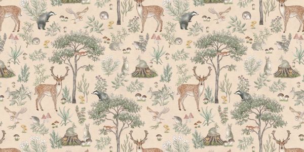 Ein magisches Waldmuster mit detaillierten Tieren wie Rehen, Kaninchen, Dachsen und Eulen, umrahmt von Bäumen, Sträuchern und Pilzen. Die vintage Hintergrundfarbe schafft eine märchenhafte, ruhige Atmosphäre, ideal um einen bezaubernden Akzent in jedem Raum hinzuzufügen.