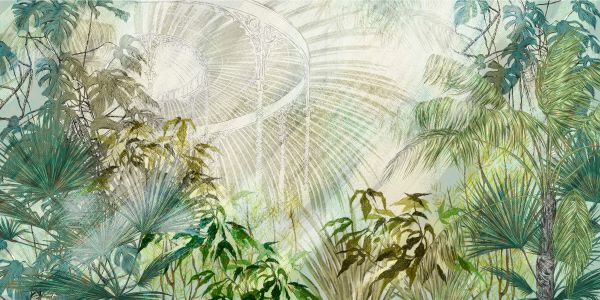 Fototapete mit einer Zeichnung eines Gewächshauses mit tropischen Pflanzen. Kombinieren Sie dies im Raum für mehr Atmosphäre.