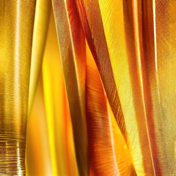 Geschichtete Streifen in Gold, Orange und Gelb bilden ein wellenförmiges Muster, das an glänzende Seide erinnert. Die Texturen und Reflexionen erzeugen eine warme, lebendige Lichtbewegung in einer luxuriösen Ausführung.