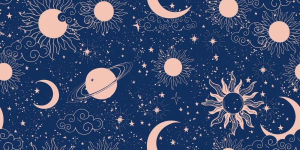 Ein verträumter Himmel voller anmutiger Sonnen, Halbmonde, Sternennebel und eines ringtragenden Planeten vor einem tiefblauen Hintergrund. Die Kombination aus sanften Pfirsichtönen und astronomischen Elementen erzeugt ein magisches, mystisches Gefühl.