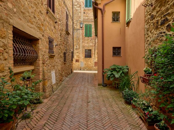 Schöne italienische Straße mit Pflanzen und Blumen an einem sonnigen Tag. Kombinieren Sie diese Fototapete in Ihrer Wohnung für noch mehr Atmosphäre.