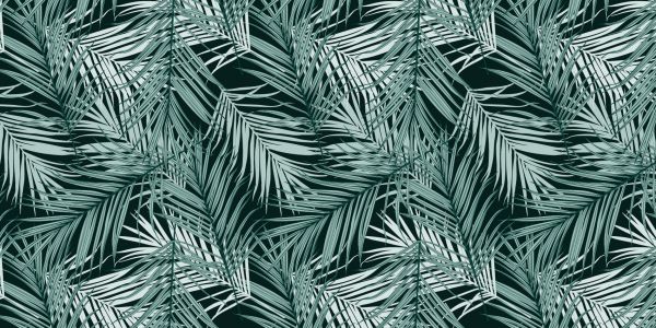 Tapete mit einem tropischen Muster mit Blättern auf schwarzem Hintergrund. Kombinieren Sie diese Tapete im Schlafzimmer.