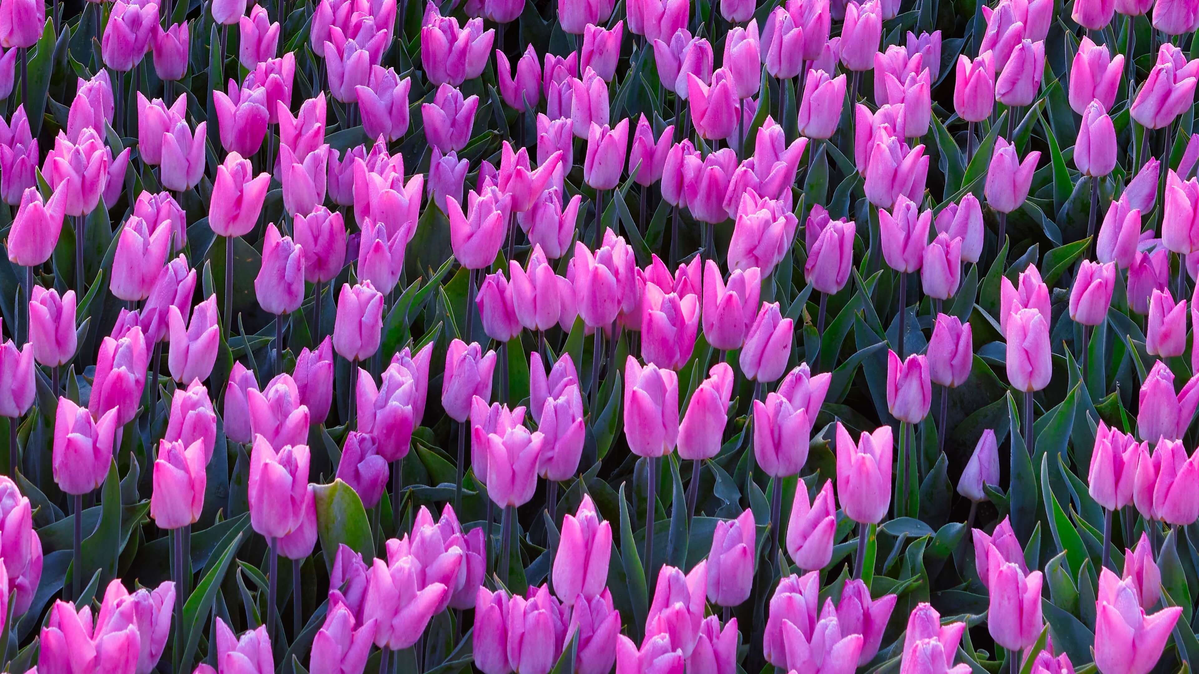Wunderschönes Tulpenfeld mit rosa Tulpen bei Sonnenaufgang