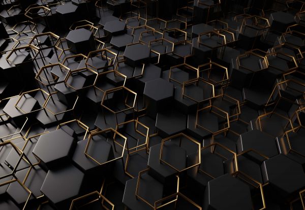 Verschnörkelte schwarze Sechsecke mit goldenen Rändern. Kombinieren Sie diese Fototapete zum Beispiel im Schlafzimmer für noch mehr Atmosphäre.