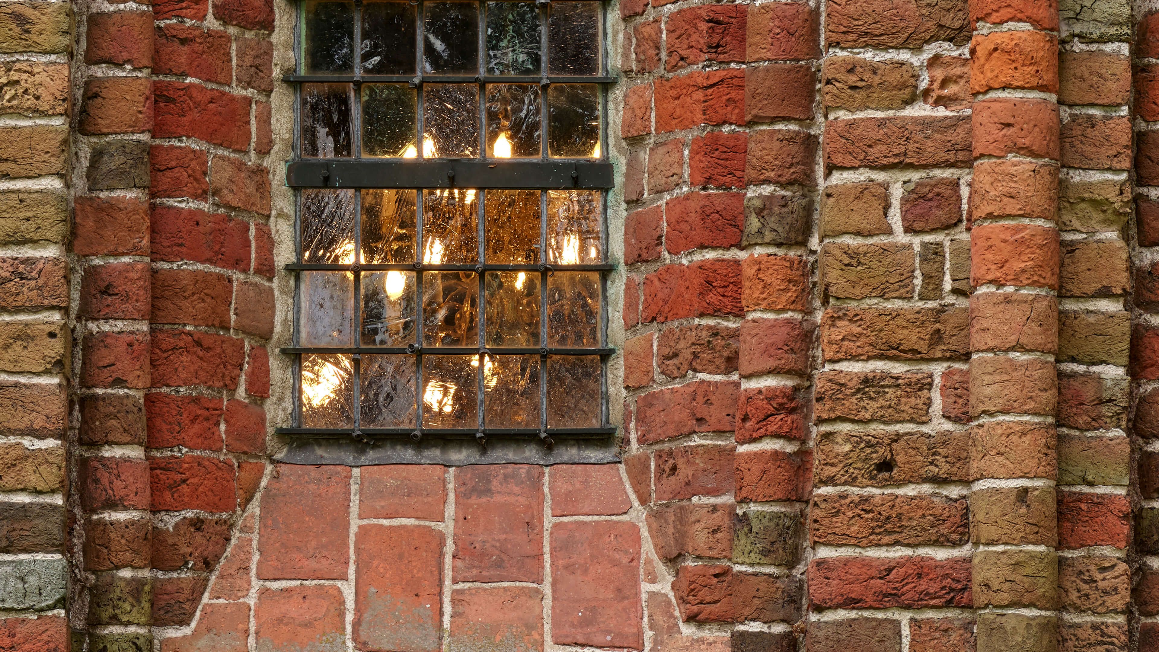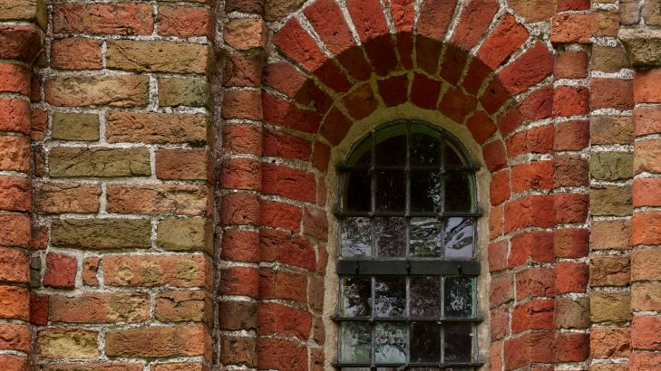 Backsteinmauer mit Bögen und Fenstern in verschiedenen Materialien
