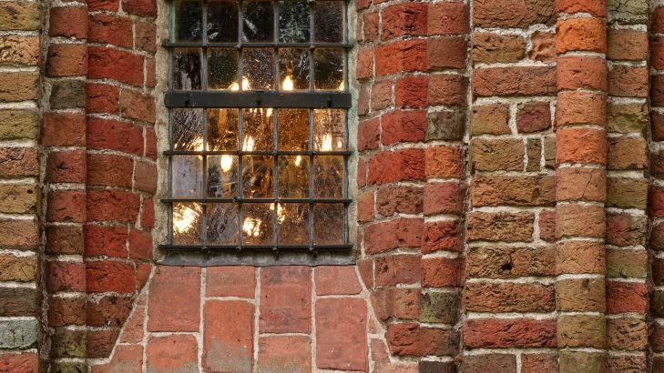 Backsteinmauer mit Bögen und Fenstern. Verwandeln Sie Ihre weiße Wand in einen echten Blickfang mit dieser Fototapete.