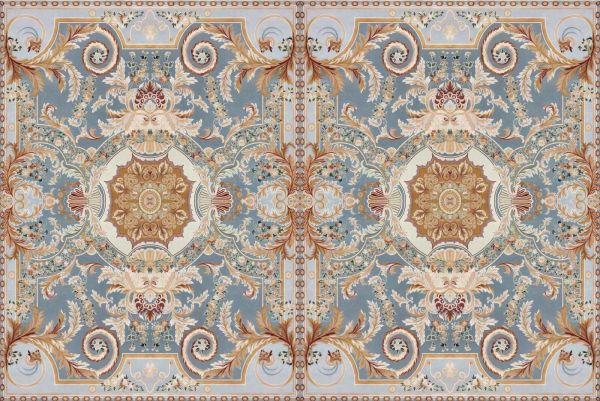 Dieses verfeinerte Muster atmet klassische Großartigkeit dank der symmetrischen Gestaltung und der Fülle an eleganten Ornamenten. Im Zentrum stehen runde Medaillons mit floralen Details, umgeben von eleganten Schwüngen, Acanthusblättern und subtilen Blumenmotiven. Der zartblaue Hintergrund bildet eine frische Basis, während warme Töne wie Gold, Terracotta, Creme und Hellgrün Tiefe und Balance schaffen. Das Zusammenspiel feiner Linien und reicher Dekoration verleiht dem Ganzen eine würdige, fast palastartige Ausstrahlung.