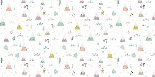 Muster von Bergen, Pflanzen und Blumen in verschiedenen Farben.