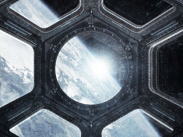 Blick auf die Erde aus einem Raumschiff. Mit dieser Fototapete wird es in Ihrem Zuhause so sein, als wären Sie selbst im Raumschiff.