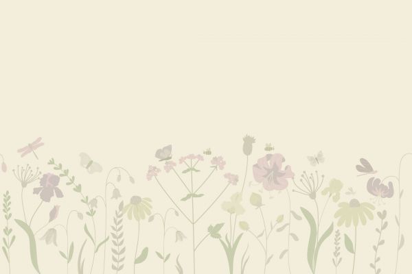 Blumenfeld mit verschiedenen Blumen und verschiedenen Insekten wie Schmetterlingen und Bienen. Farbe: Beige mit Altrosa