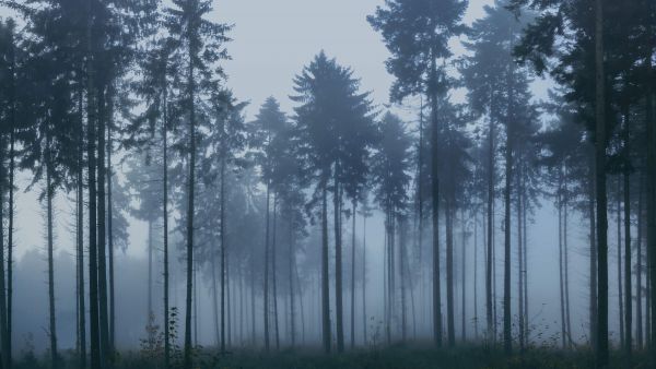 Eine neblige und graue Landschaft voller hoher Bäume.