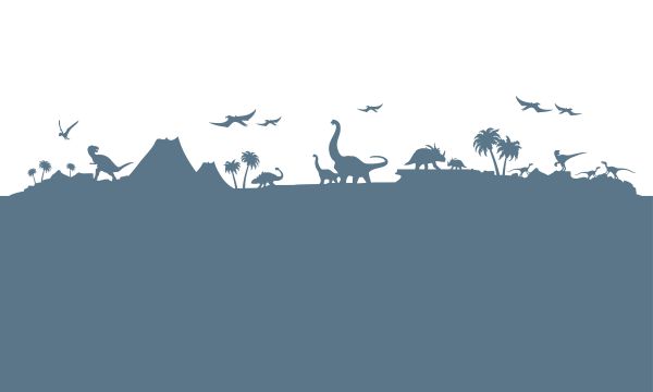 Grau-blauer Hintergrund, der sich zur Hälfte durch den Druck zieht und zu einer Silhouettenlandschaft mit Dinosauriern wird.