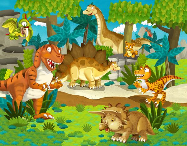 Fototapete mit Dinosaurierland. Kombinieren Sie diese im Kinderzimmer für eine lustige Atmosphäre.