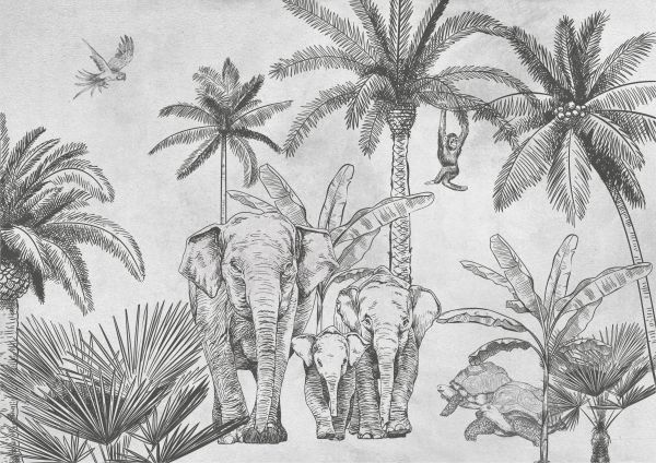 Elefanten und Schildkröten im Wald. Hippe und trendige Tapete. Diese Tapete rundet Ihr Zimmer wirklich ab.