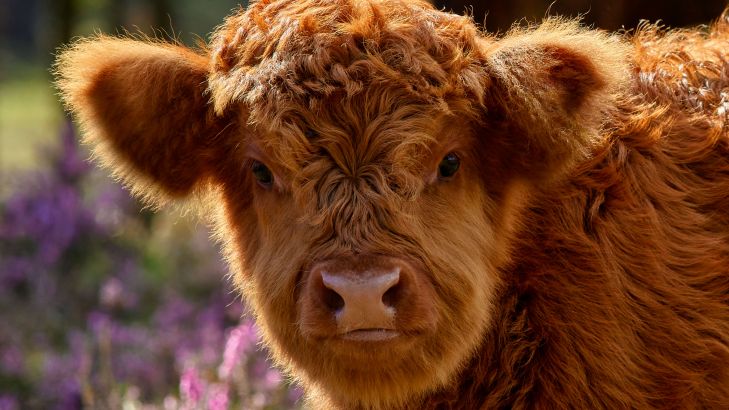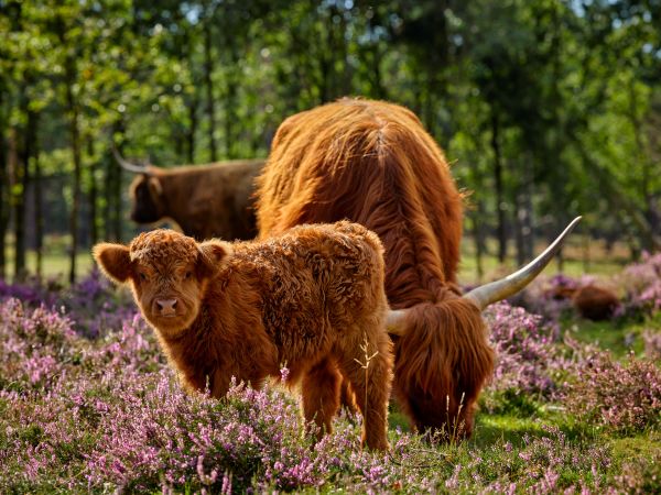 Familie der Schottischen Hochländer mit einem jungen Kalb vor sich, das messerscharf fotografiert wurde.