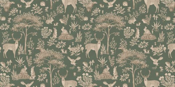 Ein magisches Waldmuster mit detaillierten Tieren wie Rehen, Kaninchen, Dachsen und Eulen, umrahmt von Bäumen, Sträuchern und Pilzen. Die vintage Hintergrundfarbe schafft eine märchenhafte, ruhige Atmosphäre, ideal um einen bezaubernden Akzent in jedem Raum hinzuzufügen.