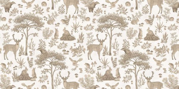 Ein magisches Waldmuster mit detaillierten Tieren wie Rehen, Kaninchen, Dachsen und Eulen, umrahmt von Bäumen, Sträuchern und Pilzen. Die vintage Hintergrundfarbe schafft eine märchenhafte, ruhige Atmosphäre, ideal um einen bezaubernden Akzent in jedem Raum hinzuzufügen.
