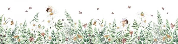 Diese bezaubernde Illustration zeigt ein sommerliches Blumenfeld voller frischer, grünblättriger Farne, weißer Gänseblümchen, eleganter Glockenblumen und pastellfarbener Wilde Blumen. Zwischen dem Grün verstecken sich kleine Elfen, die auf Blütenblättern sitzen oder zwischen den Stielen träumen. Um sie herum tanzen Schmetterlinge in sanften braun-rosé Tönen, was dem Ganzen eine märchenhafte Leichtigkeit verleiht.