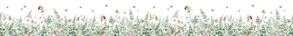 Diese elegante Gestaltung erweckt eine üppige Blumenwiese zum Leben, mit einer Fülle sanfter Grüntöne, natürlicher Akzente und warmer Pastellfarben. Zwischen den frischgrünen Blättern, Farnen und Stängeln blühen verschiedene Feldblumen wie Gänseblümchen, Margariten, Klatschmohn und Waldhyazinthen. Hin und wieder finden sich Bienen ein, die sich am Nektar gütlich tun, während Schmetterlinge ruhig durch die Luft darüber flattern. Der Stil ist raffiniert und luftig, mit viel offenem Raum nach oben hin. Die Kombination aus sanften Pinselstrichen und subtilen Farbnnuancen macht dieses Design besonders beruhigend und freundlich für das Auge. Die Farbgebung ist natürlich und frisch: Hellgrün, Olivgrün, Beige, zartrosa und warmes Weiß bilden zusammen ein harmonisches Ganzes. In einem Kinder- oder Babyzimmer sorgt dieses Design für eine verträumte, ruhige Atmosphäre mit einem Hauch Verspieltheit. Kombinieren Sie es mit Möbeln in hellem Holz, Textilien aus Leinen oder Baumwolle, und Accessoires in Erdtönen oder zartem Rosa für eine natürliche Ausstrahlung. Auch in einer Boho- oder ländlichen Einrichtung kommt dieses Design ausgezeichnet zur Geltung, zum Beispiel als Akzentwand hinter einem Bett oder einer Wickelkommode. Das Muster ist detailreich, ohne überladen zu wirken, was es sowohl für kleine als auch für große Räume geeignet macht. Die Anwesenheit von Insekten wie Bienen und Schmetterlingen verleiht eine lebendige Note, ohne das Gesamtbild unruhig zu machen. Diese Blumenwiese bringt die Schönheit der Natur ins Haus und sorgt für eine frische, fröhliche und beruhigende Atmosphäre.