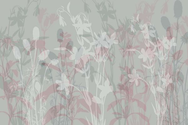 Ein raffiniertes Spiel aus transparenten floralen Schatten in zarten Blautönen auf einem weichen, graugrünen Hintergrund. Die anmutigen Silhouetten wilder Blumen schaffen eine luftige und beruhigende Komposition, die perfekt mit der natürlichen Umgebung harmoniert.