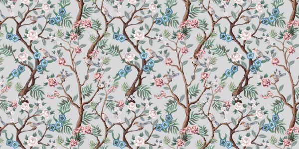 Dieses Muster zeigt eine lebendige Ansammlung von Zweigen, die reichlich mit bunten Blüten und anmutigen Vögeln bedeckt sind. Das Muster strahlt einen Hauch von knospendem Frühling aus, mit einer Farbpalette, die Ruhe und natürliche Schönheit ausstrahlt.