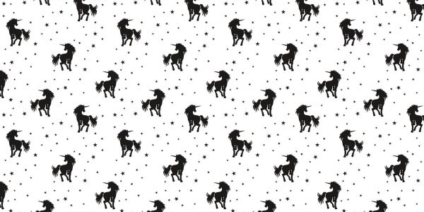 Ein Muster aus fröliche Einhörnern in Schwarz auf weißem Hintergrund mit schwarzen Sternen.