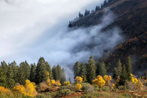 Goldene Herbstfarben leuchten zwischen dunkelgrünen Nadelbäumen auf, während Nebelschwaden langsam durch den Bergwald ziehen. Ein Spiel von Farbe und Stille, das eine mystische und ruhige Atmosphäre heraufbeschwört.