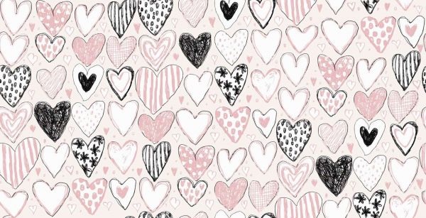 Dieses charmante Design vereint verspielte Spontaneität mit einer sanften, romantischen Ausstrahlung. Die handgezeichneten Herzen variieren in Stil und Struktur: einige sind mit schwarzer Tinte ausgefüllt, andere in pastellrosa Nuancen gehalten, und manche bleiben elegant weiß. Die Muster im Inneren – von Punkten, Streifen und Blümchen bis hin zu bleistiftähnlichen Kritzeleien – verleihen dem Ganzen einen verspielten, nahezu kindlichen Charme, ohne kindisch zu wirken. Der Hintergrund ist in einem zarten Rosaton gehalten und dezent mit kleinen, rhythmisch platzierten Herzchen verziert, wodurch das Design leicht und fröhlich wirkt. In einem skandinavischen Interieur kommt dieses Design als Akzentwand in einem Mädchenzimmer, einer Spielecke oder einem kreativen Raum besonders gut zur Geltung, da es Helligkeit und Schlichtheit mit einer heiteren Note verbindet. Auch im Rahmen eines bohemischen Stils, der handwerkliche Elemente, verspielte Muster und geschichtete Texturen schätzt, fügt sich dieses Design ideal ein – beispielsweise in Kombination mit weichen Stoffen, Rattanmöbeln und farbenfrohen Accessoires. Kombinieren Sie dieses Design mit weißen oder hellgrauen Möbeln, um das Farbschema sanft und harmonisch zu halten. Fügen Sie Accessoires in Altrosa, Puderblau oder Matt-Schwarz hinzu, um eine zeitgemäße Note zu erzielen. Für einen markanteren Auftritt können dekorative Kissen oder Poster mit handgezeichneten Illustrationen oder Kalligrafien eine verspielte Verbindung zum Muster herstellen. Dank seines leichten und liebevollen Charakters ist dieses Muster ideal für Räume wie Kinderzimmer, Heimbüros oder sogar gemütliche Leseecken geeignet. Es vermittelt ein Gefühl von Freude, Leichtigkeit und Liebe, während die Vielfalt der Formen und Farben visuelle Dynamik hinzufügt.