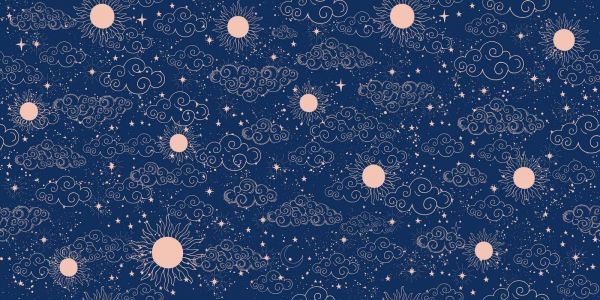 Ein magisches Muster aus zierlichen Wolken, Sternen und Sonnen an einem tiefblauen Himmel – perfekt für mystische oder beruhigende Entwürfe.