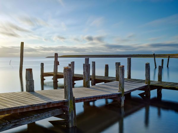 Schöner Holzsteg bei Sonnenaufgang auf einer der Watteninseln. Verwandeln Sie Ihre Wand in einen echten Blickfang.