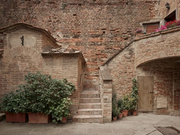 Innenhof mit schönen Blumen in Italien. Kombinieren Sie diese Fototapete zum Beispiel in Ihrem Wohnzimmer.