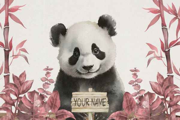Inmitten der frischen Natur von Bambusblättern blickt ein kleiner Panda mit großen, unschuldigen Augen in die Welt hinaus. Das kontrastreiche schwarz-weiße Fell bildet einen schönen Kontrast zu den umliegenden Pflanzen in Rosatönen, während der heitere Hintergrund eine ruhige natürliche Umgebung suggeriert.