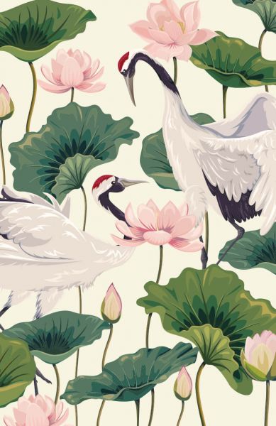 Ein Kranichpaar zwischen den Lotusblumen. Kombinieren Sie diese Fototapete in Ihrem Schlafzimmer oder Wohnzimmer.