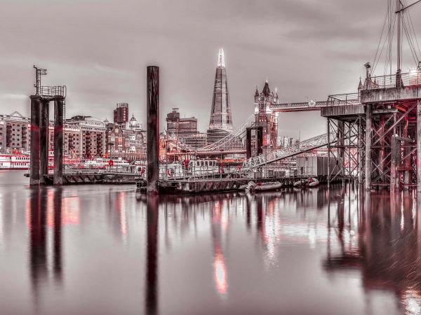London am Abend. Die roten Lichter in der Stadt heben sich gut ab.