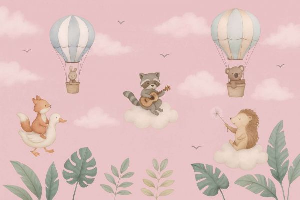 In diesem zarten Design schweben Waldtiere durch einen sanften rosa Himmel voller Wolken und pastellgrünen Blättern. Ein Waschbär spielt auf einer Wolke Gitarre, während ein Igel einen flauschigen Löwenzahn hält. In der Zwischenzeit fahren ein Kaninchen und ein Bär in Luftballons mit subtilen Blautönen mit. Unten sehen wir einen Fuchs, der fröhlich auf dem Rücken einer freundlichen Gans reist, umgeben von anmutigen Blättern in Graugrün und Minze. Die Farbgebung besteht aus sanften Pastellfarben: Hellrosa, Puderblau, Creme, Terrakotta und Graugrün. Der Illustrationsstil ist zart und freundlich, mit runden Formen und weichen Texturen, die Ruhe ausstrahlen. Dank des rosa Himmels mit subtilen Wolken wirkt das Ganze luftig und liebevoll, perfekt als Dekor für ein Babyzimmer. Dieses Design passt gut zu Interieurs im romantischen, skandinavischen oder märchenhaften Stil. Kombinieren Sie es mit Möbeln in Weiß oder hellem Holz, Textilien in Pastellrosa, Hellblau oder Sandtönen und Accessoires wie Wolkenlampen, Hängepflanzen oder gefilzten Tieren an der Wand. Ein Mobile oder eine Wanddekoration mit Ballons oder Blättern passt hier perfekt dazu. Geeignet für Babyzimmer, Spielbereiche oder ruhige Leseecken. Dieses Bild schafft eine behagliche Atmosphäre und lädt zur Fantasie und zu ruhigen Träumen ein. Das Design wächst mit dem Kind mit, dank seines zeitlosen Erscheinungsbilds und des subtilen Farbgebungs.
