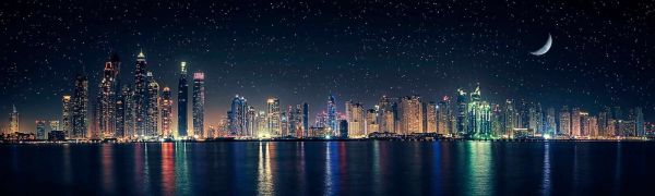 Ein atemberaubender Blick auf eine moderne Skyline voller Lichtreflexe, unter einem funkelnden Sternenhimmel mit einem schmalen Mond. Das farbige Glühen der Wolkenkratzer spiegelt sich lebhaft im ruhigen Wasser wider.