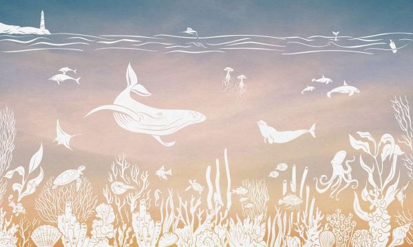 Eine serene Unterwasserlandschaft mit Walen, Rochen und anderen Meereslebewesen in sanften Farbtönen. Das Design fängt die Ruhe des Ozeans mit minimalistischen Details, subtilen Korallen und Schatten ein, die eine raffinierte Atmosphäre schaffen.