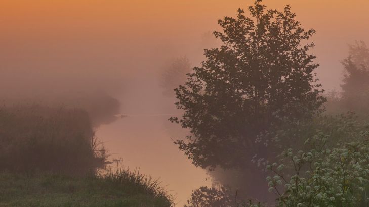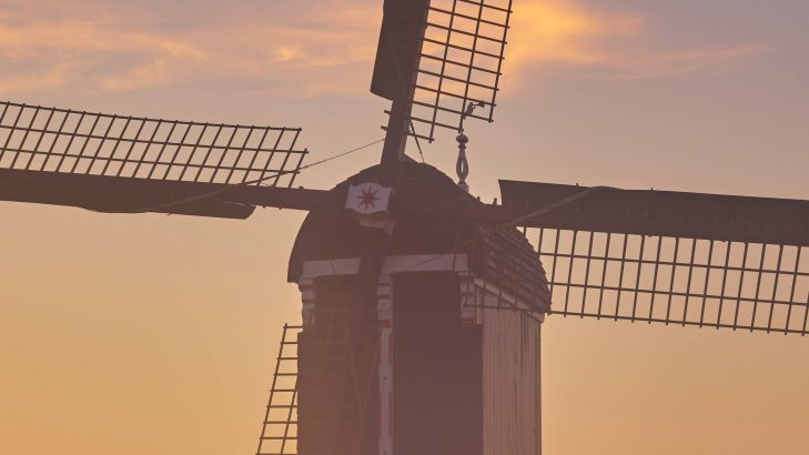 Mühle bei einem Sonnenaufgang. Der Sonnenaufgang hat den Himmel in ein wunderschönes Orange getaucht.
