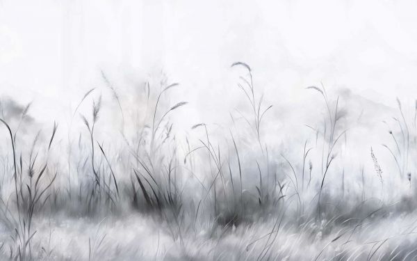 Wogendes Feldgras in sanften Grautönen bewegt sich subtil in einer leichten Brise. Die raffinierte Aquarelltechnik und feinen Pinselstriche verleihen dem Design eine ruhige und elegante Ausstrahlung, ideal für ein beruhigendes und harmonisches Interieur.