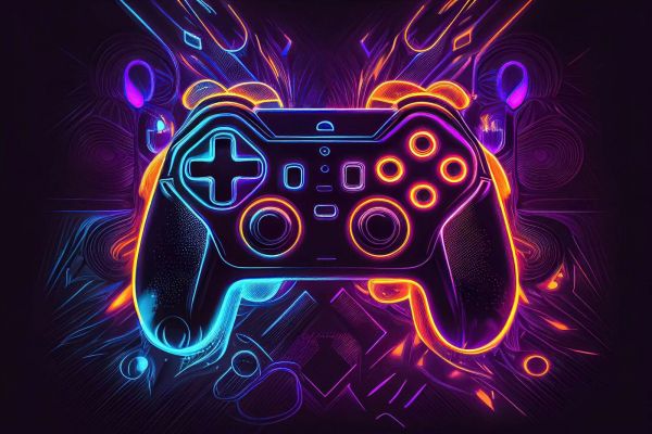 Ein beeindruckendes Spieldesign mit einem neonbeleuchteten Gamecontroller, der in leuchtenden Blau-, Lila- und Orangetönen strahlt. Der abstrakte Hintergrund mit digitalen Lichtmustern und dynamischen Linien schafft ein futuristisches und hochmodernes Ambiente, perfekt für das ultimative Gaming-Zimmer.