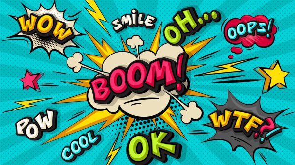 Dieses lebendige Design entführt Sie in die Welt der klassischen Comics, mit eingängigen Lautmalereien wie "BOOM!", "WOW!" und "OOPS!" vor einem strukturierten türkisfarbenen Hintergrund. Die fröhlichen Farben und die verspielte Typografie erzeugen eine starke und jugendliche Energie.