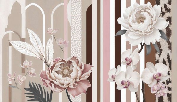 Große Pfingstrosen und elegante Orchideen in sanften Blush- und Cremetönen werden mit vertikalen Streifen und zierlichen architektonischen Bögen kombiniert. Die warme Farbpalette aus Beige, Rosa und Braun sorgt für eine stilvolle, moderne und leicht exotische Ausstrahlung.