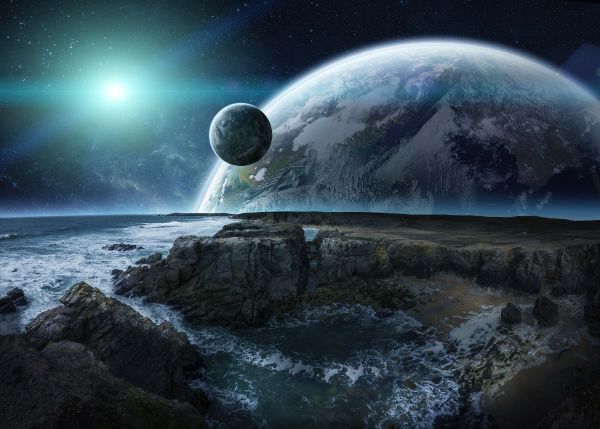 Ansicht des Planetensystems von den Klippen aus. Diese Fototapete hat einen 3D-Effekt, der es so aussehen lässt, als käme der kleine Planet ins Zimmer.