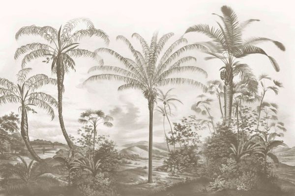 Eine zurückhaltende tropische Szenerie mit ruhigen Taupe- und Beigetönen, die eine warme, neutrale Basis schaffen. Die sanften Konturen von Palmen und Hügeln verleihen einen subtilen, eleganten Charme.