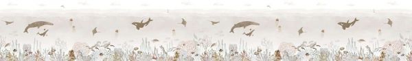 Diese Illustration zeigt eine friedliche Unterwasserwelt, in der Wale und Orcas ruhig zwischen Quallen, Rochen, Fischen und Schildkröten schwimmen. Der Meeresboden ist reich an Korallenstrukturen, Muscheln und Seetang und in sanften Tönen wie Beige, Sand, Taupe und Graugrün ausgearbeitet. Die sanften Verlauffarben im Hintergrund ahmen eine leichte unterseeische Nebelbildung nach, was ein Gefühl von Tiefe und Ruhe erzeugt. Das zurückhaltende Farbenspiel macht dieses Design äußerst geeignet für Innenräume, in denen Neutralität und Gelassenheit im Vordergrund stehen. Denken Sie an ein Babyzimmer mit Möbeln aus naturbelassenem Holz, Leinenstoffen und Accessoires in Creme, Beige oder hellem Terracotta. Auch in einem modernen oder skandinavischen Wohnstil passt dieses Design perfekt, beispielsweise als subtile Blickfang an einer langen Wand oder über einem Bett. Der Illustrationsstil ist verfeinert und luftig, mit einem natürlichen Fluss von Formen und Strukturen. Die Kombination aus weichen Linien, hellen Farben und organischen Mustern verleiht eine ausgewogene Ausstrahlung. Trotz der reichen Unterwasser-Details bleibt das Gesamtbild atmungsaktiv und visuell beruhigend. Dieses Design ist ideal für Räume, in denen Ruhe und Naturerlebnis zusammenkommen, wie Kinderschlafzimmer, Badezimmer, Spielbereiche oder sogar Wellnessbereiche. Es bringt eine Prise Meer ins Haus, ohne zu dominieren, und lädt zur Entspannung und Verwunderung ein.